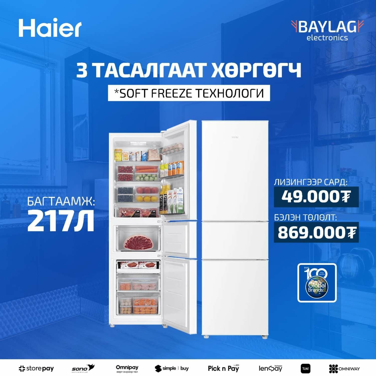 ❄️ Haier брэндийн – 217 литрийн багтаамжтай, гурван хаалгатай, орон зай хэмнэсэн зохион байгуулалттай хөргөгч.